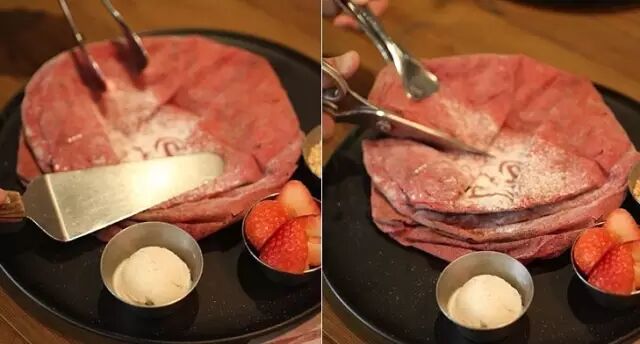 待火焰熄灭后,职员会从一侧帮你慢慢剪开,比萨的原型才会慢慢显露。比萨厚度十足,因为加入了墨鱼汁,所以面饼呈现出少见的黑色。比萨上不仅有清淡鲜嫩的蘑菇,还有略带咸味的香肠和萨拉米,配合酸甜的番茄酱,构成了独特的炸弹比萨。用剪子剪成块状后,职员会在现场细细研磨意大利帕达诺干奶酪,直至撒满整块比萨。