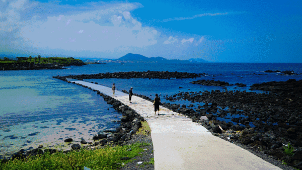 城山日出峰位于济州岛东端,海拔 182m,是 10 万年前海底火山爆发而形成,是一块高耸的巨岩,其顶部有巨大的火山口。火山口直径600m,深 90m,面积达 8 万㎡。99 块尖石围绕在火山口周围,就像一个被森林覆盖的“迷失世界”。东南面及北面是悬崖,只有西北面是草坪山脊,与城山村相连。由于山脊上铺了草坪,既可散步,也可骑马。城山日出峰顶观日出可谓是叹为观止。附近的油菜花一到春天就开得黄灿灿,在其间观看日出更是美妙无比。城山日出峰于 2000 年 7 月 19日被指定为地方天然纪念物,2007 年被联合国教科文组织指定为世界自然遗产。攀登通向火山口边缘的台阶只需 20 分钟。你可以尝试登山观看日出,不过,要进行日出探险,你需要在日出村过夜。除了日出探险外,白天徒步也是不错的选择。