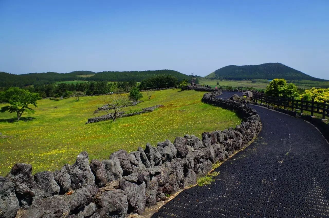 山君不离是济州岛上特有的没有火山熔岩体的喷火口。其高为100米左右、周岩约为2公里、总面积为29.8万平方米,是一个拥有420多种温带、亚热带及高山植物是天然植物的宝库。山君不离的景区设计还是很有特色的,路面都是废弃的轮胎改造的,若遇雨雪天,可以起到隔水、防滑的作用。此外,眺望台上的望远镜可以眺望远处的城山日出峰,是最佳观景点。