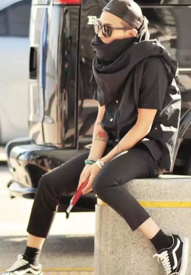 简单的黑色搭配,权志龙用围巾和反戴帽子来凹造型。
