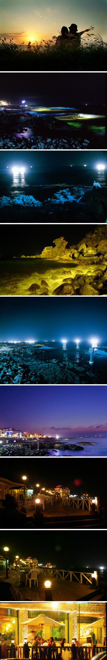 位于济州岛市中心的龙潭的海边。这里的夜景跟白天不一样!和恋人或者和朋友一起欣赏美丽的落照,也可以找一家可心的咖啡屋欣赏着夜景品尝咖啡。