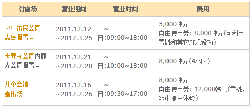 京畿道果川的主题公园首尔乐园滑雪场是制造全家都难忘的冬日回忆最好的场所。和地面紧紧贴着的塑料雪橇能增强滑雪的刺激感,滑道分为成人用和儿童用滑道,增加了滑雪的安全性。这里设置的可以和子女一起乘坐的儿童用滑道很受家庭为单位的游客的欢迎,尽管需要游人亲自拉着雪橇爬到最顶端,但是拉着坐在雪橇上的孩子一起走到顶端未尝不是另一番乐趣。 在这里还可以享受在以坡道为主的游乐场里打雪仗,堆雪人等各种各样冰雪游戏,也可以利用为幼儿设计的滑雪场。只要持有首尔乐园的通票就可以享受滑雪场的乐趣,但是只购买首尔乐园的门票时还需另支付3,000韩元的滑雪场入场券。 |