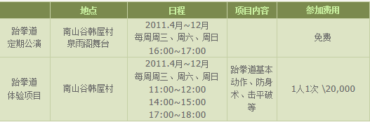 跆拳道是韩国特有的传统国技,这项运动特别适于锻炼体力,提高精神修为,在海内外都享有盛名。国技院以到访韩国的外国游客为对象,开设了学习跆拳道的地方,采用简单有趣的方式进行授课。 <南山谷韩屋村跆拳道体验教室> 教授地点南山谷韩屋村,1个小时的课时内,主要学习跆拳道的基本动作、护身术、击破等,结合外国人兴趣和水平授课,简单易学。4月至10月期间,每周周三、周六、周日(每天3次)上课,必须提前从网上或打电话预约。5人以上登录时,方可开课。 1人参加费用为2万韩元,20名以上团体参加申请时,提前调整日期及时间后,可提供团体单独的授课方式。 咨询及预约 : 国技院主页 : http://www.taekwonseoul.org/ch_main/regist_02.html (韩英日中) 电子邮箱 : taekwondo@taekwonseoul.org 国技院电话 : TEL. 3469-0134 课程结束后,颁发结业证书,还将为学员们提供身着跆拳道服拍照留念的机会。还可参加南山韩屋村的体验活动、参观传统舞蹈和跆拳道结合的跆拳道示范表演。每周周三、周六、周日 16:00~17:00有跆拳道定期示范表演。 <跆拳道定期公演 ‘跆拳道的传说(Legend of Taekwondo)’> 韩国的传统舞蹈与跆拳道动作相融合而成的定期公演‘跆拳道的传说(Legend of Taekwondo)’,讲述与妒忌世间和平之神的斗争,努力创造美好、充满希望世界的故事的无言剧跆拳道演出。 此公演由3幕构成,第1幕‘静逸之晨的国家,韩国’第2幕‘跆拳道之魂’,第3幕为‘跆拳道的传说’。每周三、六、日下午4点~5点,在南山谷韩屋村的泉雨阁舞台上进行表演。观众们可以免费欣赏到在跆拳道体验教室里看不到的跆拳道精湛、华丽的动作和击破表演等。 http://www.taekwonseoul.org/2011test/chn/index.html (韩英日中)