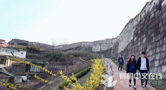首尔城北区三仙洞长寿村旁的旧城路上,漫步的市民络绎不绝,路边还开满了黄灿灿的迎春花。骆山地区方便行走,尤其深受年轻人喜爱。