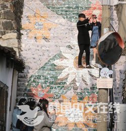 上图为游客在梨花洞壁画村的楼梯上合影留念。壁画村是中国游客的必经之地。春季是适宜步行的季节。来到汉阳古城骆山地区,即使没有准备登山鞋,也可轻松漫步。与东大门相比,从惠化门出发是更为理想的选择。在地铁4号线汉城大学入口站下车,出4号出口后步行约150米左右即可到达目的地。那里随处可见拿着相机与自拍杆恋人们。